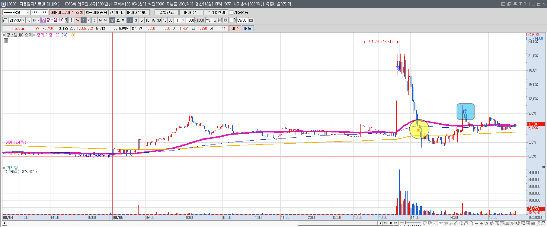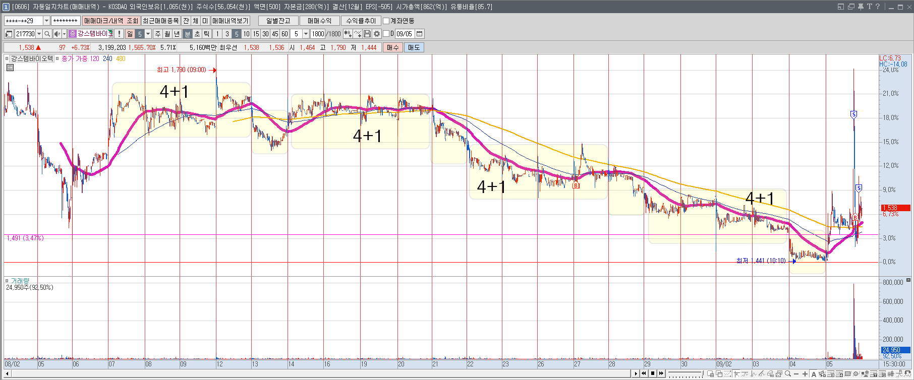3. 약 2주 동안 저항선 역할을 하던 5분봉 480일선을 골드크로스하고 해당 이평선 위에서 주가가 등락을 함.