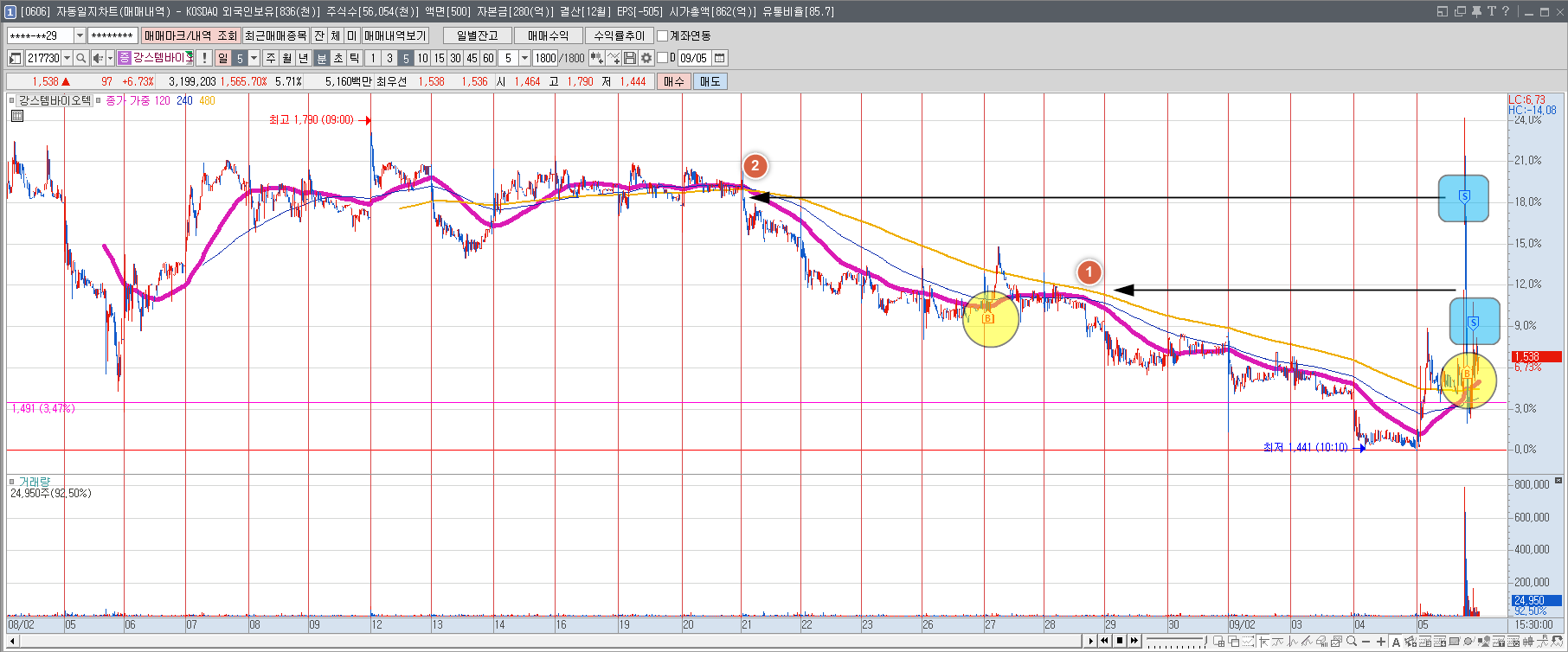 (1차 vi 가격대는 ① 8월 말의 가격대 부근) - 약 2주 동안 저항선 역할을 하던 5분봉 480일선을 골드크로스하고 해당 이평선 위에서 주가가 등락을 함.