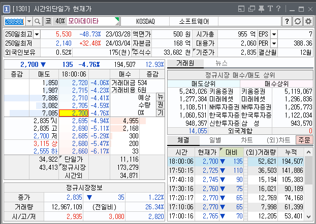 결과는 아래와 같이 시간외단일가에서 -5% 수준으로 급락했습니다.