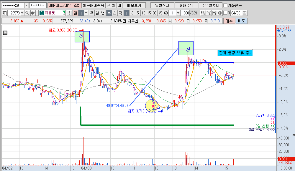 이엠넷 장 초에 시가가 떠서 시작을 하는 움직임 포착되어 예상 시가에 매도를 걸어두었었는데