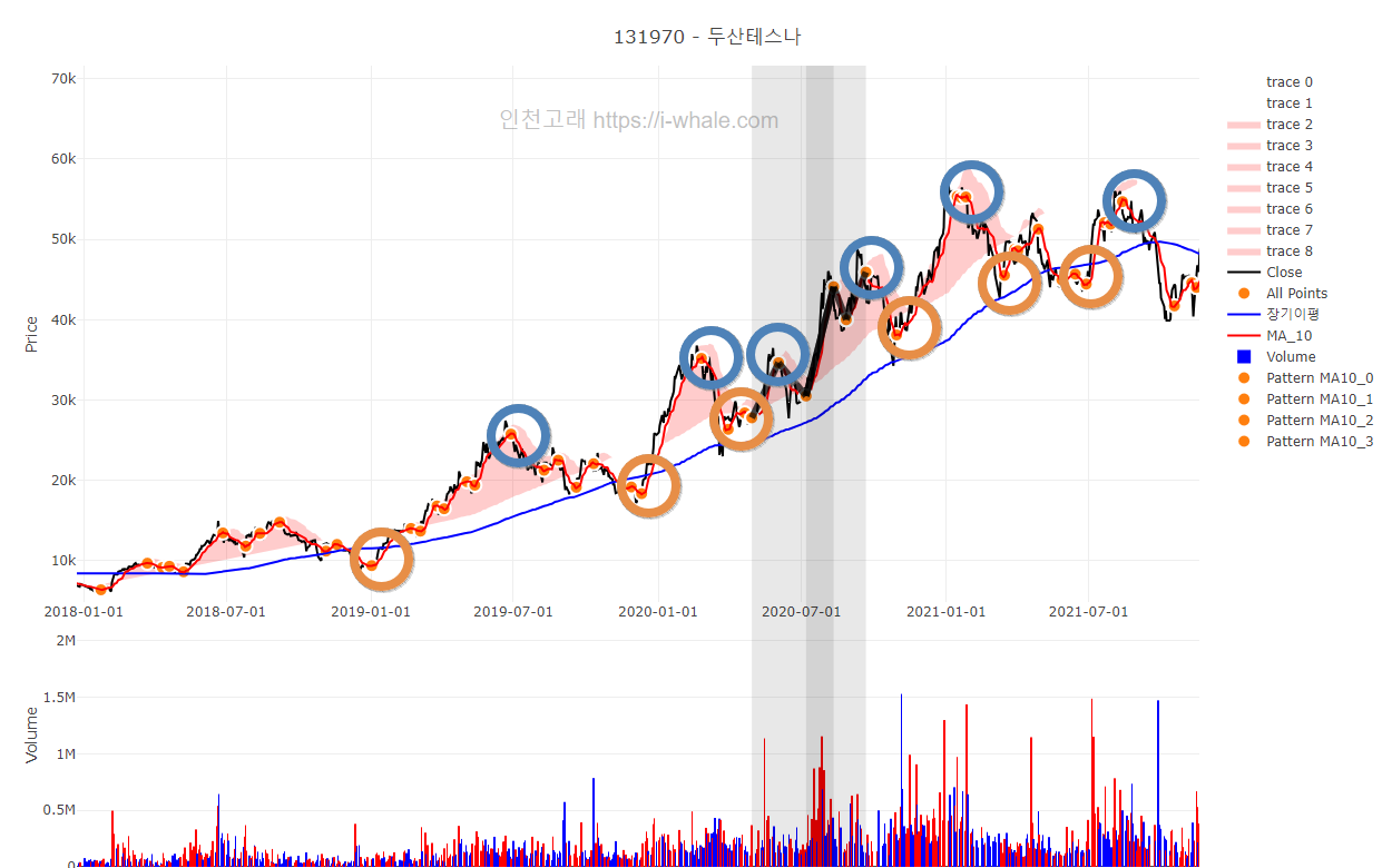 '리가켐바이오'는 하락 추세답게 하락을 하면서 이동평균선이 전 고점을 돌파하지 못하고 있으며 저점도 이전의 저점을 갱신합니다. 반대로 '두산테스나'는 상승 추세답게 상승하면서 이전의 고점(Peak)을 돌파하면서 상승 추세가 유지되다가 전 저점을 이탈하는 모습이 감지됩니다.