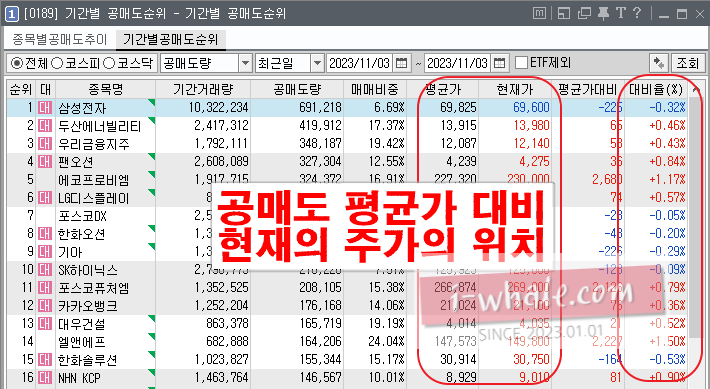 대비율은 평균가 대비이므로 대비율이 마이너스(-)된 종목이 공매도 세력이 수익 중인 종목이라 할 수 있습니다.