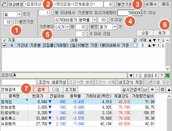 오늘은 기준봉 시가 혹은 중심가격을 기준으로 현재의 주가의 근접률에 따라 종목을 검색하는 방법에 대해 알아보았습니다.