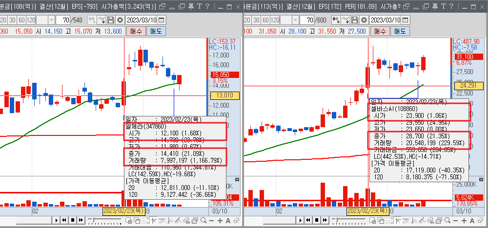 그러면 아래와 같이 두 종목 다 10일 전에 기준봉이 만들어져 있는 것을 확인할 수 있습니다.