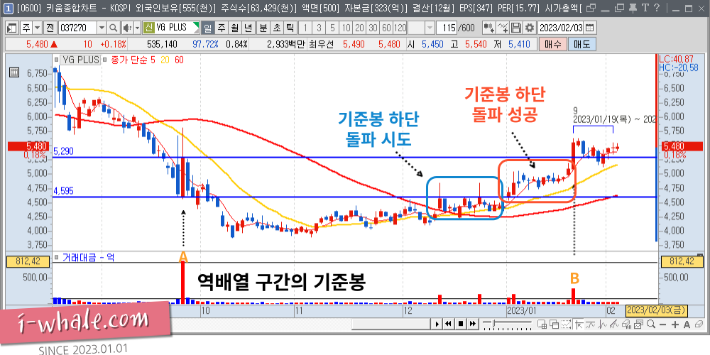 안녕하세요. 인천고래입니다. 주가는 연속적인 흐름올 개별적이 될 수 없으며 항상 이전 주가의 영향을 받게 됩니다. 이전 글에서 YG PLUS의 기준봉의 흐름을 살펴보았었는데 역배열에서 발생한
