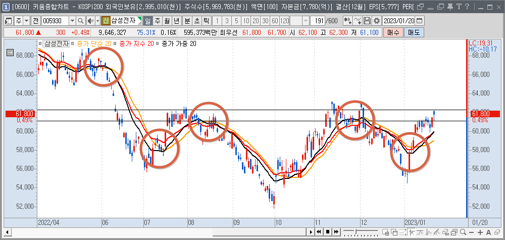 - 12월경의 동그라미 : 상단에 단순이평, 제일 하단에 가중 이평이 깔리며 하락 추세로 전환합니다.