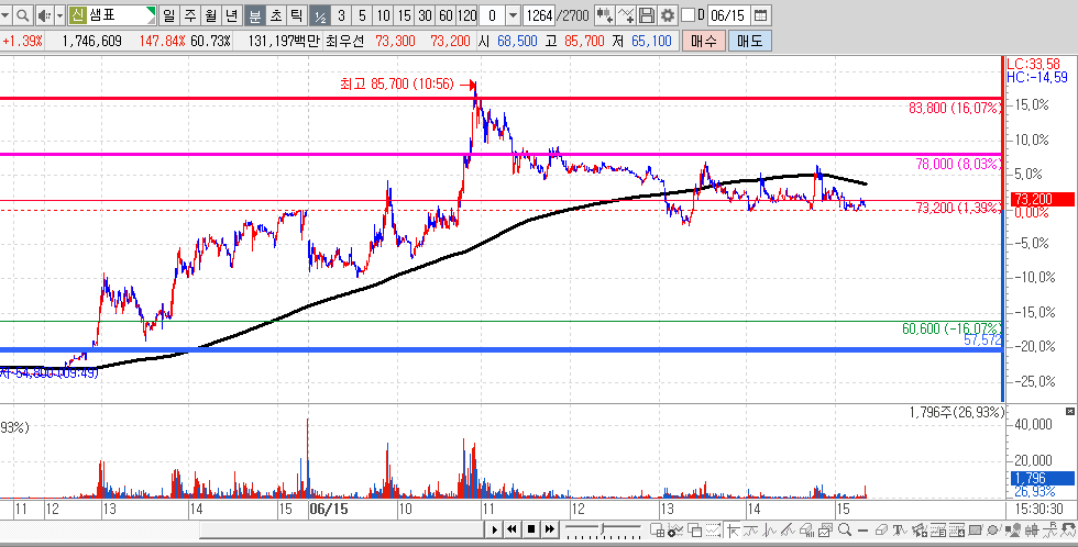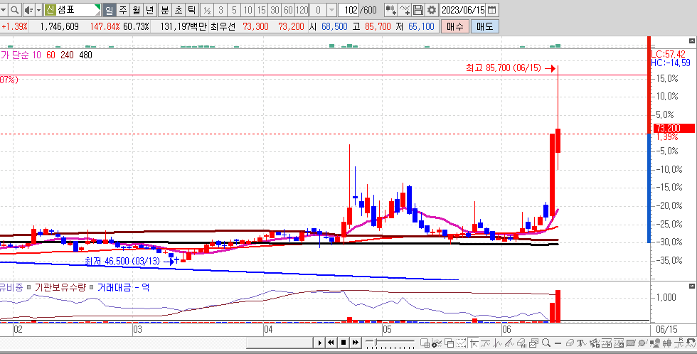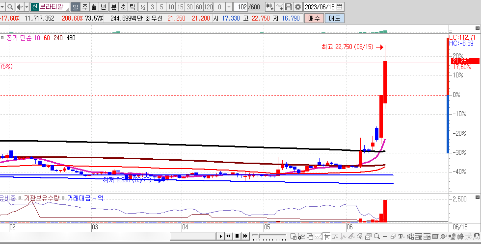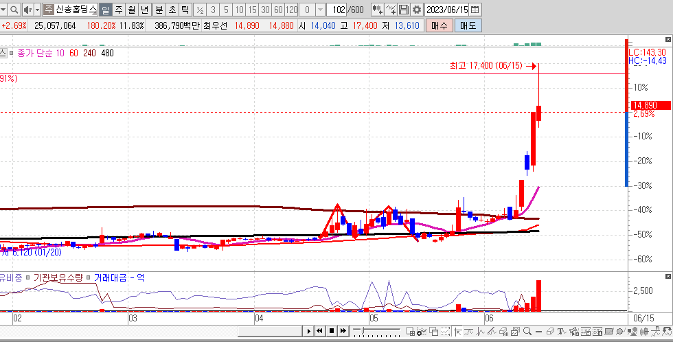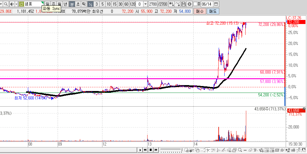 아래는 6월 14일에 상한가가 발생한 종목(신송홀딩스, 샘표, 보라티알)들의 분봉차트입니다.