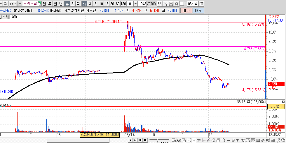 그럼 크리스탈신소재는 인디에프와는 어떤 차이가 있었는지? 분봉을 확인해 보도록 하겠습니다.