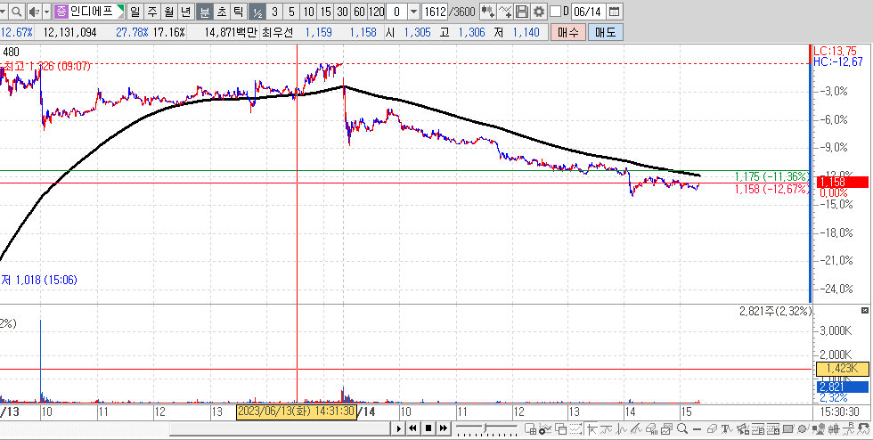 인디에프는 2023년 5월 19일 상한가 이후에 눌림 조정구간을 거친 후 6월 13일에 상한가를 기록한 종목입니다.