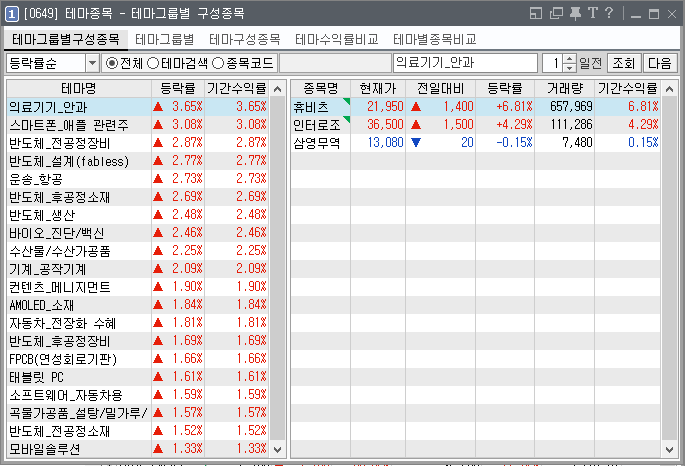 키움증권 HTS에서 <0649> 화면번호를 입력하면 아래의 이미지와 같은 <테마종목> 화면이 열립니다.