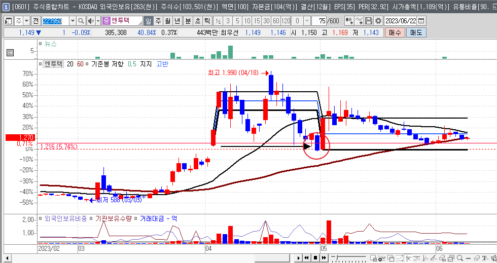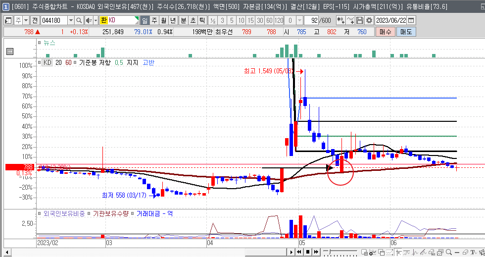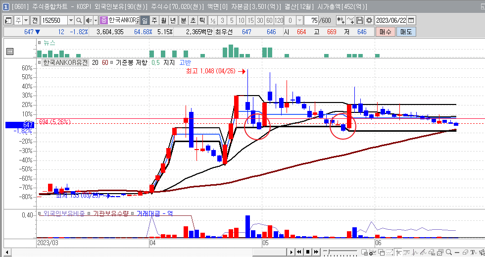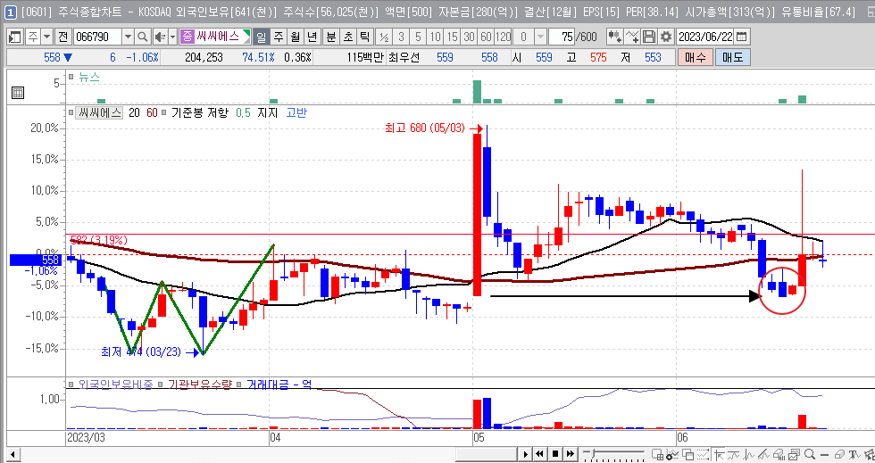 상한가인데 장중 잦은 풀림과 상한가 잔량을 충분히 쌓지 못한 경우라면 보통 첫 힘이 나온 자리 부분에선 첫 상한가 하단구간에서 지지가 되는 경향을 많이 보인다.
