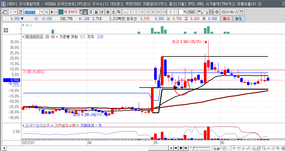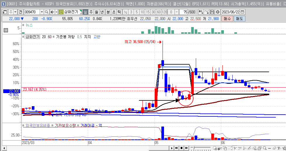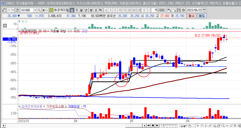 이평선의 지지는 흐름과 상황에 따라 예측이 어려운 측면이 있으나 단기간 세력에 의한 급등한 이후 장대음봉으로 단기간에 그동안 상승폭을 잠재우는 하락이 나왔다면 보통 힘이 처음 나온 자리 부근에서 반등할 확률이 매우 크다.