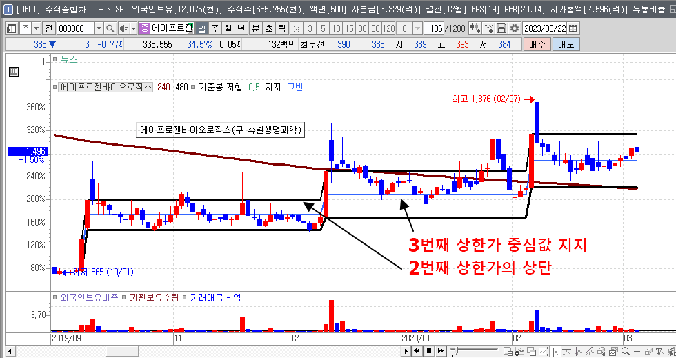 에이프로젠바이오로직스 (구 슈넬생명과학) 코멘트 : 책 속의 예제는 2012년도를 기준으로 작성이 되어 있기 때문에 최신 차트를 기준으로 리뷰합니다. 첫 번째 상한가 이후 2번째 상한가가 발생한 케이스로 2번째 상한가 하단이 지지가 유지되고 있는 것을 확인됩니다. 저자는 연속적인 상한가는 세력주로 정의를 하고 있고 세력주를 매매할 경우 확률이 높아진다고 했습니다. 저자가 알려준 내용은 아래의 차트에서 결과로 증명이 되는 것 같습니다. 에이프로젠바이오로직스 3상, 상한가 눌림목 구간, 매수 타점코멘트 : 아래의 내용도 책에는 없는 내용입니다. 그리고 2번째 상한가 고점을 돌파하는 3번째 상한가가 발생이 되었는데 이런 케이스는 3번째 상한가의 중심이 2번째 상한가의 고점과 맞물려 있기 때문에 3번째 상한가는 중심값에서 지지가 될 확률이 높아진 것으로 이해를 해야 합니다.
