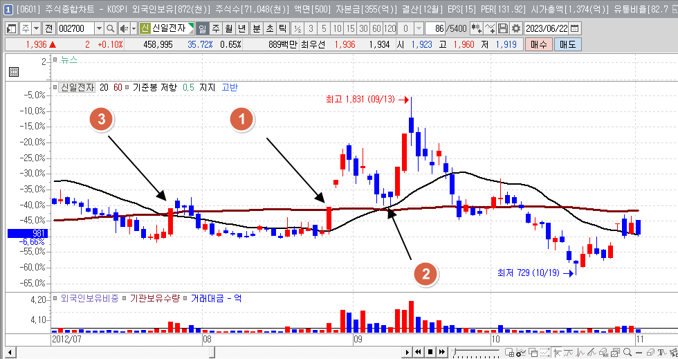 신일전자 2012년도 12월의 상한가 이후의 주가 흐름입니다. (상한가 : 15%인 시절...) 1번 구간에서 상한가가 발생이 되었고 포스팅 서두에 올린 이미지와 정확히 맞아떨어지는 차트라 할 수 있습니다. 2번 구간에서 상한가의 고점 + 단기 20 이평 지지 + 장기이평선 60, 120 이평선 지지 코멘트 : 2번 구간이 지지가 될 확률이 높았던 이유는 3번 구간이 있었기 때문으로 풀이됩니다.