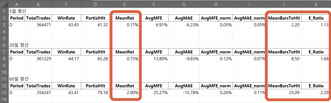 백테스팅 - 보유 기간에 따른 수익 극대화(MeanRet & E-Ratio & MeanBarsToHit)