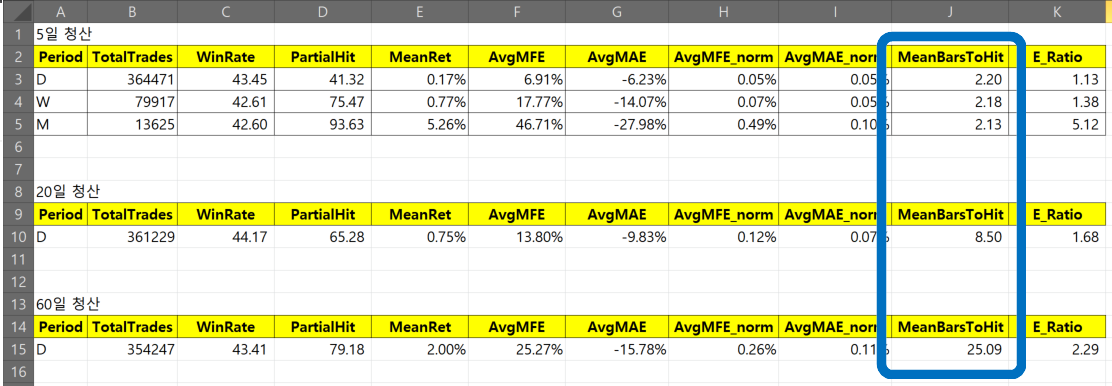 즉 “평균값(예: MeanBarsToHit값이 25 봉)이 길어 보여도,