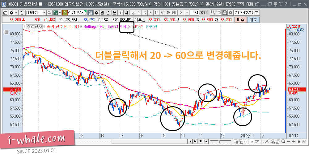 아래와 같이 수치를 20에서 60으로 변경해줍니다. 볼린저밴드 기간 60, 표준편차 2