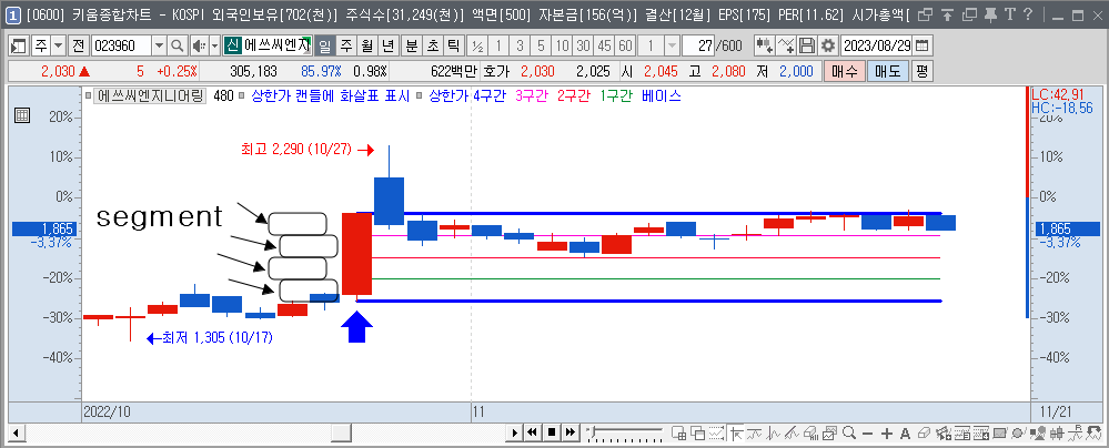 오늘은 이전글에 이어서 상한가 캔들 혹은 기준봉의 저점과 고점을 대상으로 4등분 선을 그려보도록 하겠습니다.