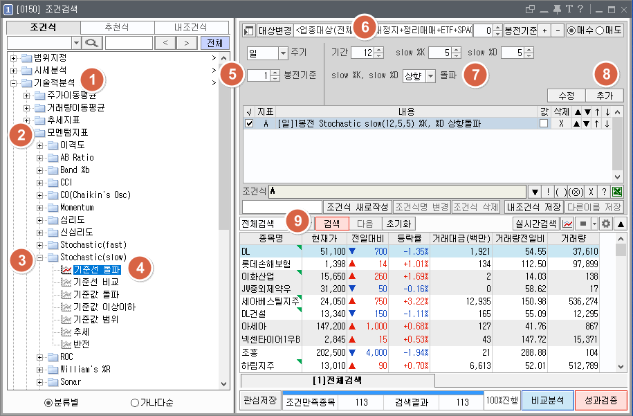 1. 스토캐스틱 기준선 돌파 검색식 만들기