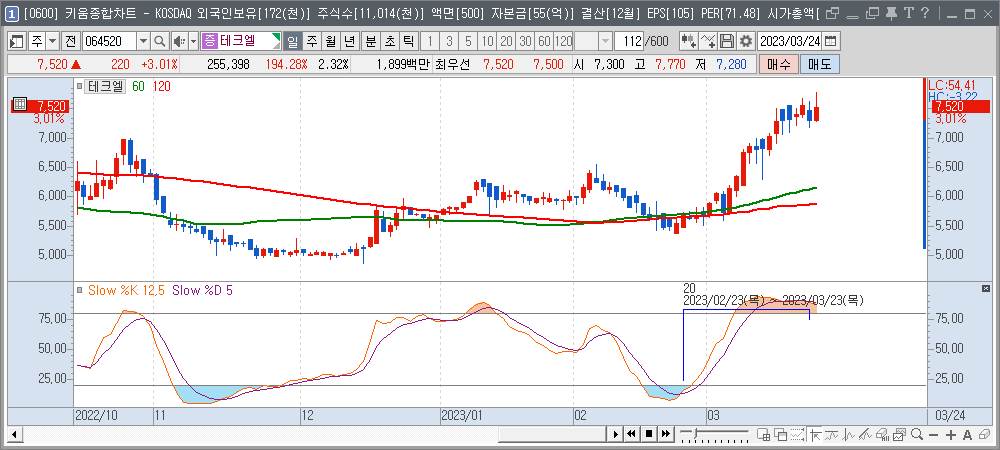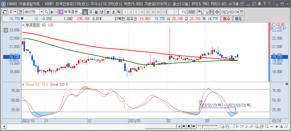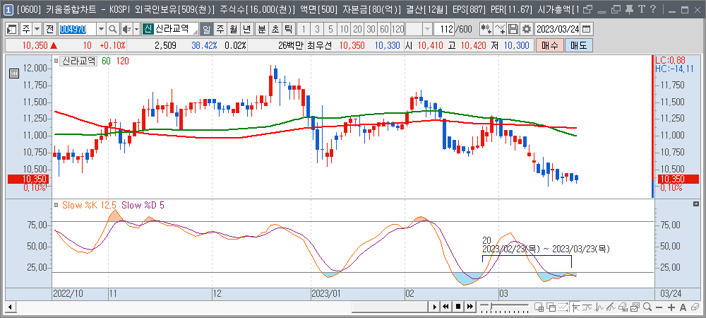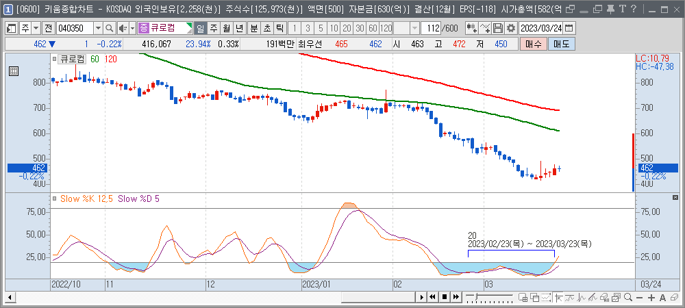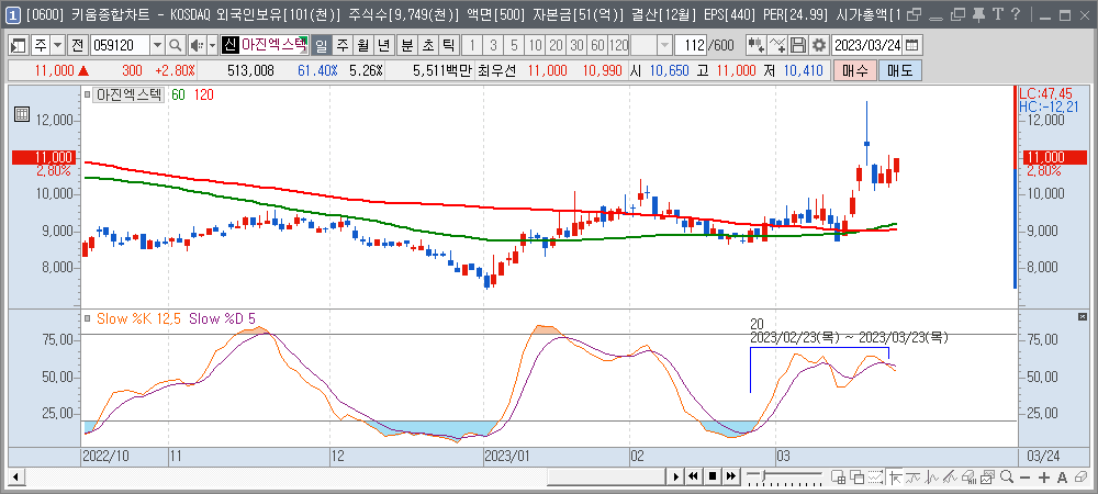 60일선 혹은 120일선이 정배열 상태가 되어야 스토캐스틱이 20이하에서라도 반등할 확률이 높아집니다.