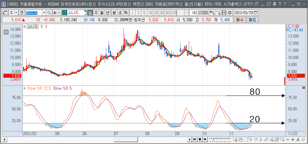 스토캐스틱은 0에서 100 사이의 값을 가지며, 일반적으로 20 이하를 과매도 구간, 80 이상을 과매수 구간으로 간주하며 0~100 사이에 주가는 위치하게 되어 20에 매수, 80에 매도하는 것이 거의 공식처럼 되어 있습니다.