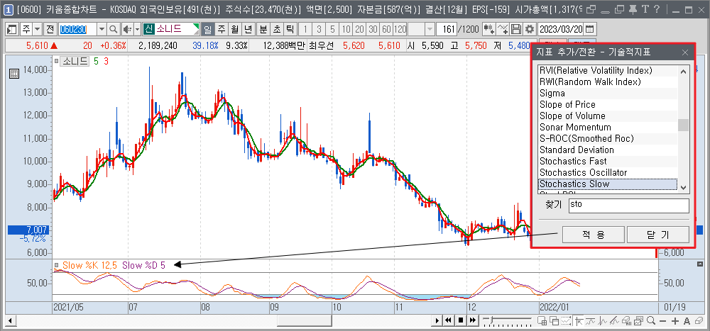 차트에서 마우스 오른쪽 버튼 클릭 > "지표 추가" 선택 > "찾기"에서 "sto"를 입력 > 위의 리스트에서 "Stochastics Slow"를 선택 > "적용" 버튼을 클릭하면 차트 하단에 스토캐스틱이 표시됩니다.