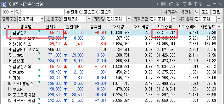 - <검색> 버튼을 클릭하여 개별 종목의 시가 총액을 확인하면 됩니다.