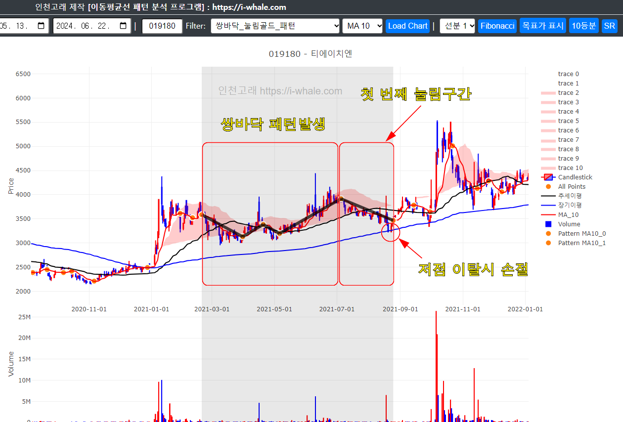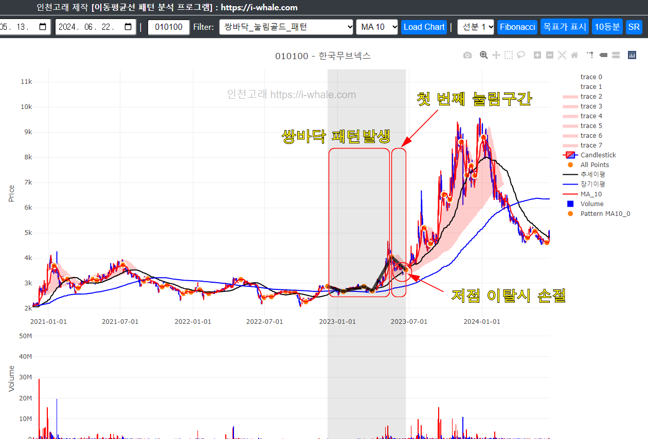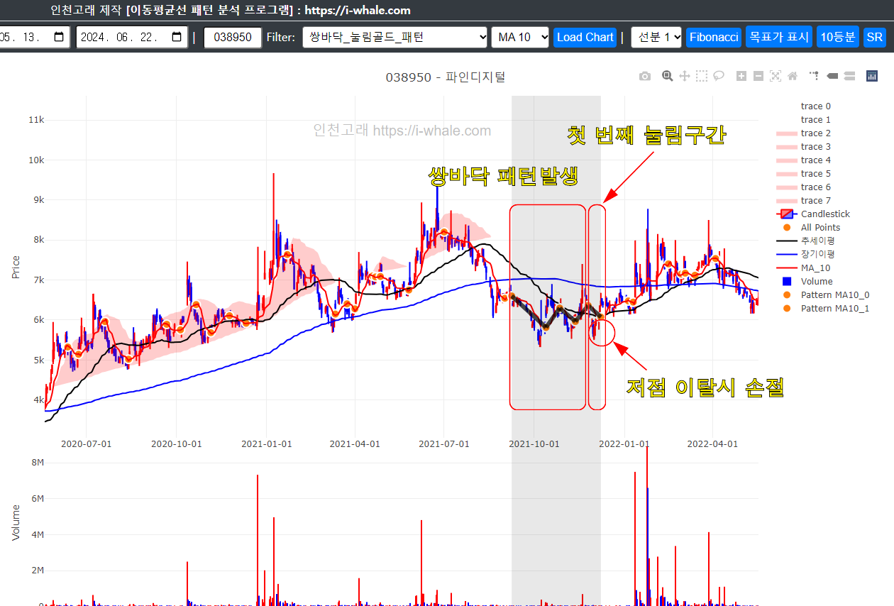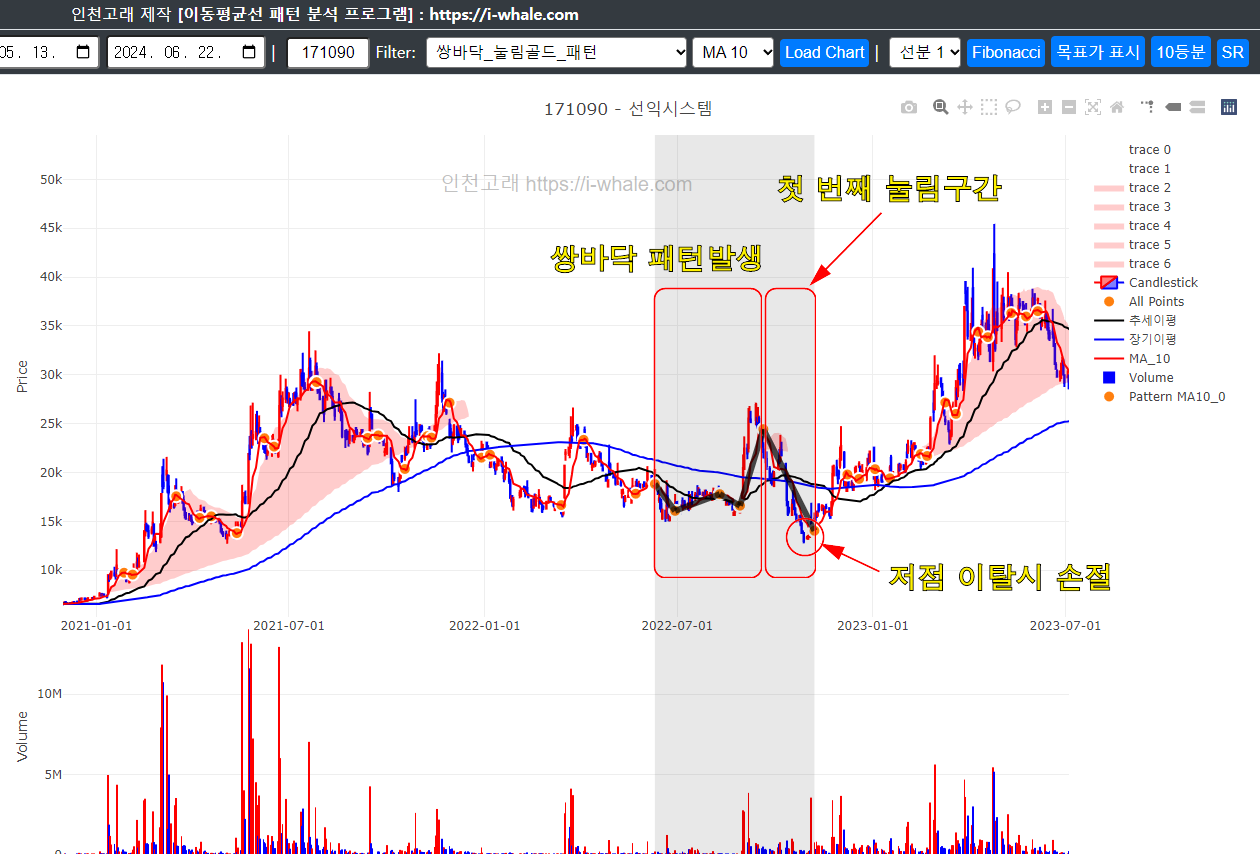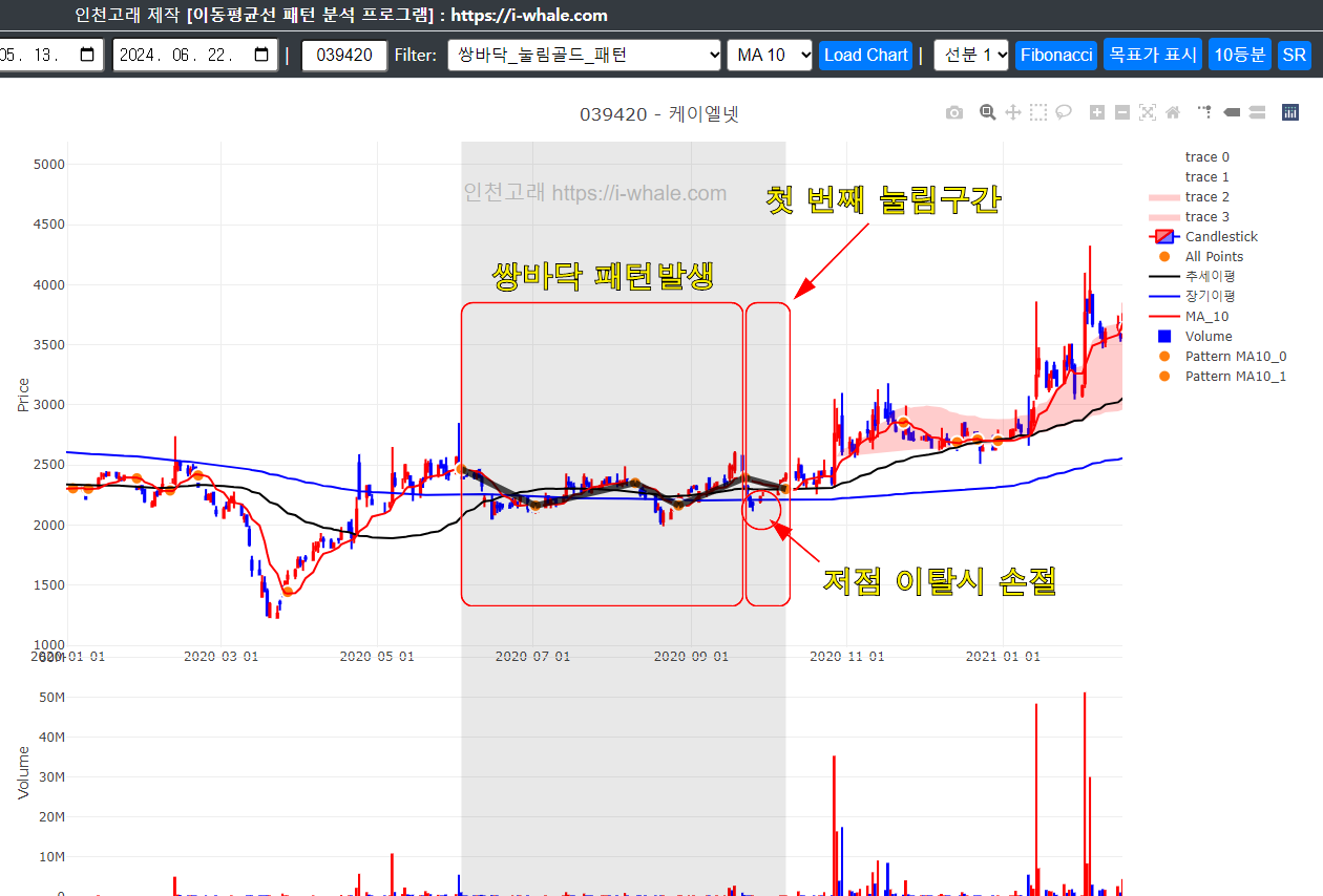 이동평균선으로 만들어진 쌍바닥의 지지가 어디에서 발생이 되는지 찾아야 합니다.