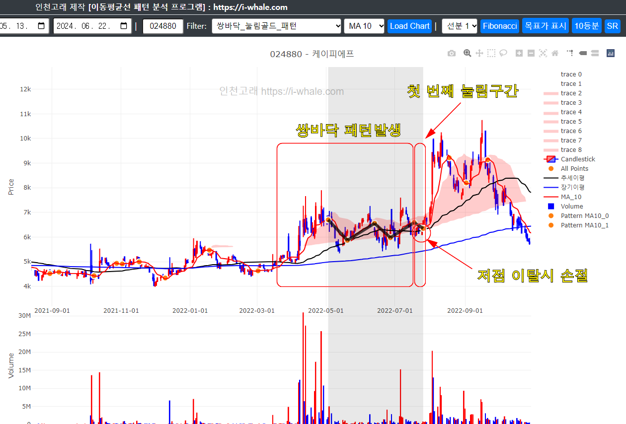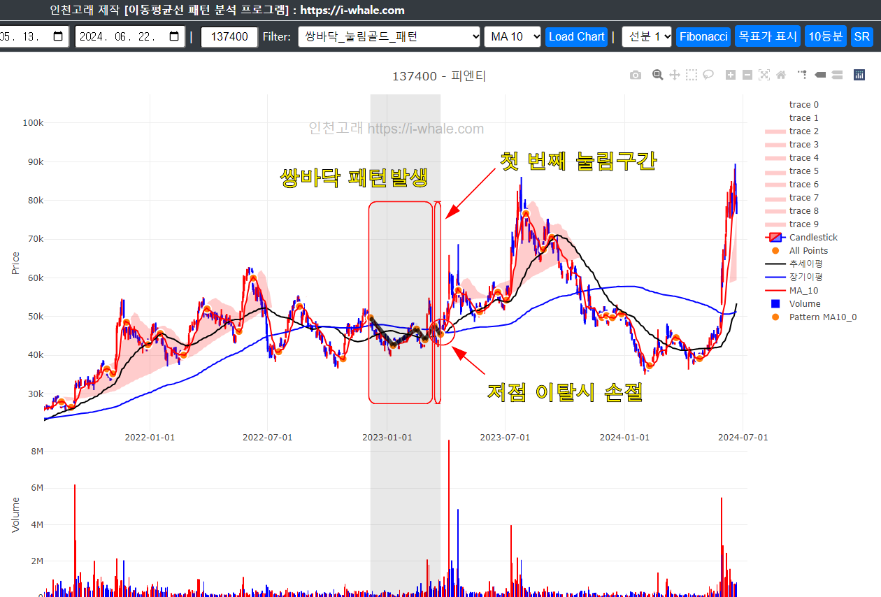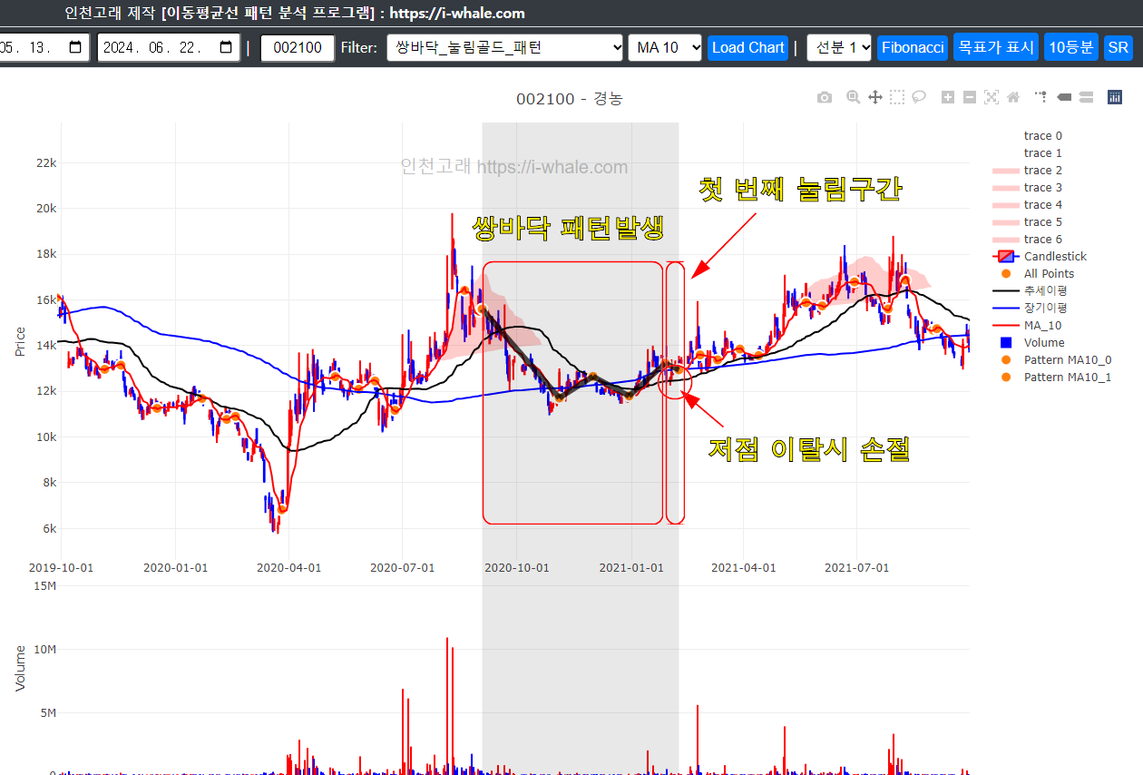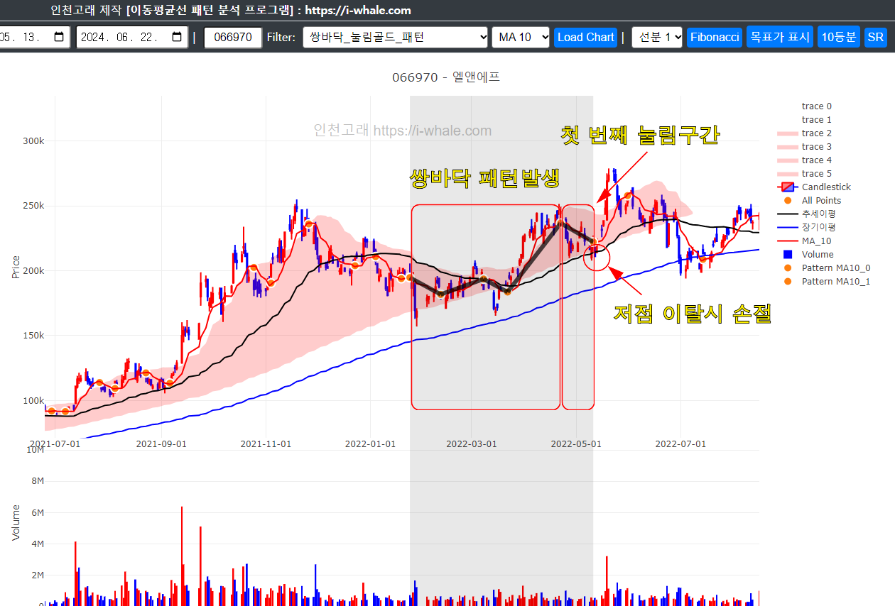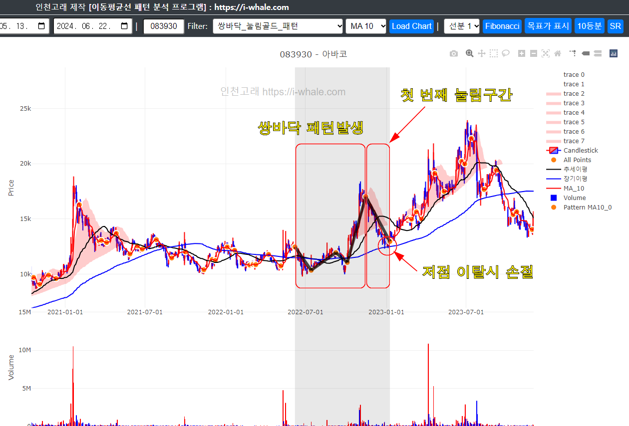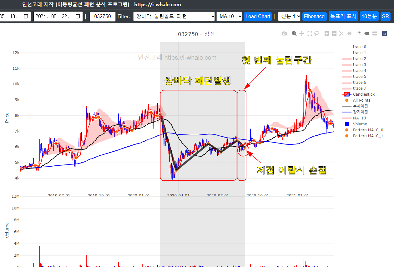 이동평균선으로 만들어진 쌍바닥의 지지가 어디에서 발생이 되는지 찾아야 합니다.