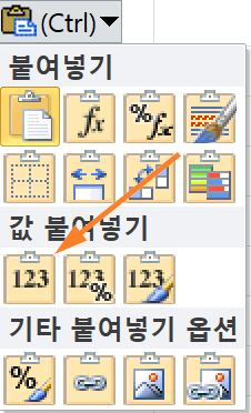 - 원하시는 컬럼을 선택하여 붙여넣기를 하시되 붙여 넣으신 뒤 "붙여넣기 옵션"에서 "123"를 선택하셔서 값으로 붙여넣기를 하시면 됩니다.