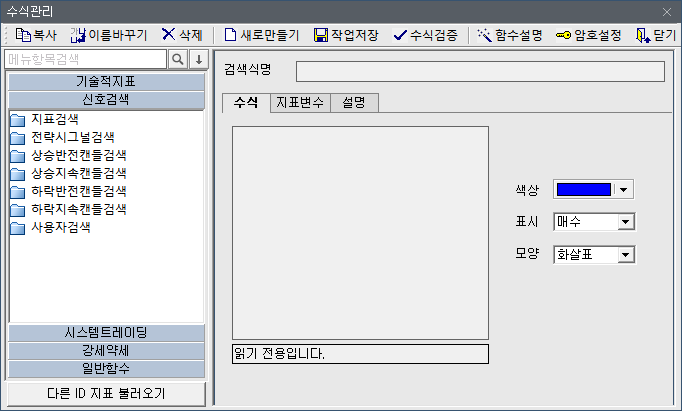 차트 위에서 오른쪽 버튼 > 수식관리자를 선택 > 신호검색 선택합니다. (아래의 이미지와 같은 창이 나와야 합니다.)
