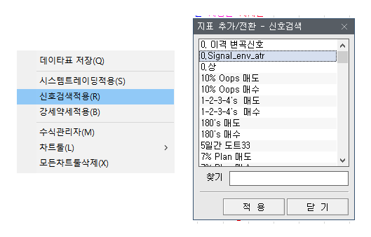 차트 위에서 우측버튼 클릭 > 신호검색적용 클릭 > "0.Signal_env_atr"을 더블클릭합니다.