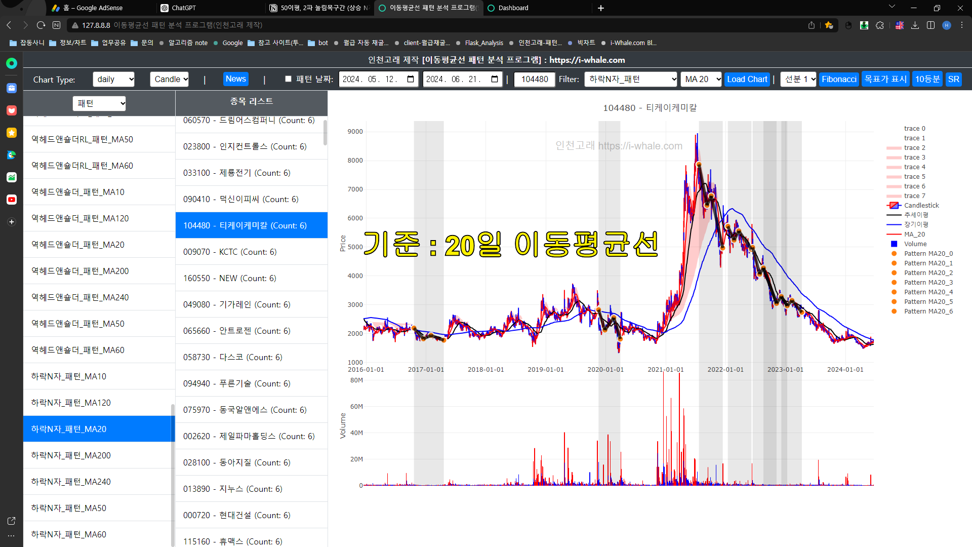 종목은 티케이케미칼로 동일하고 하락 N자 패턴이 발생하는 이동평균선의 기준을 20일로만 변경한 것입니다.