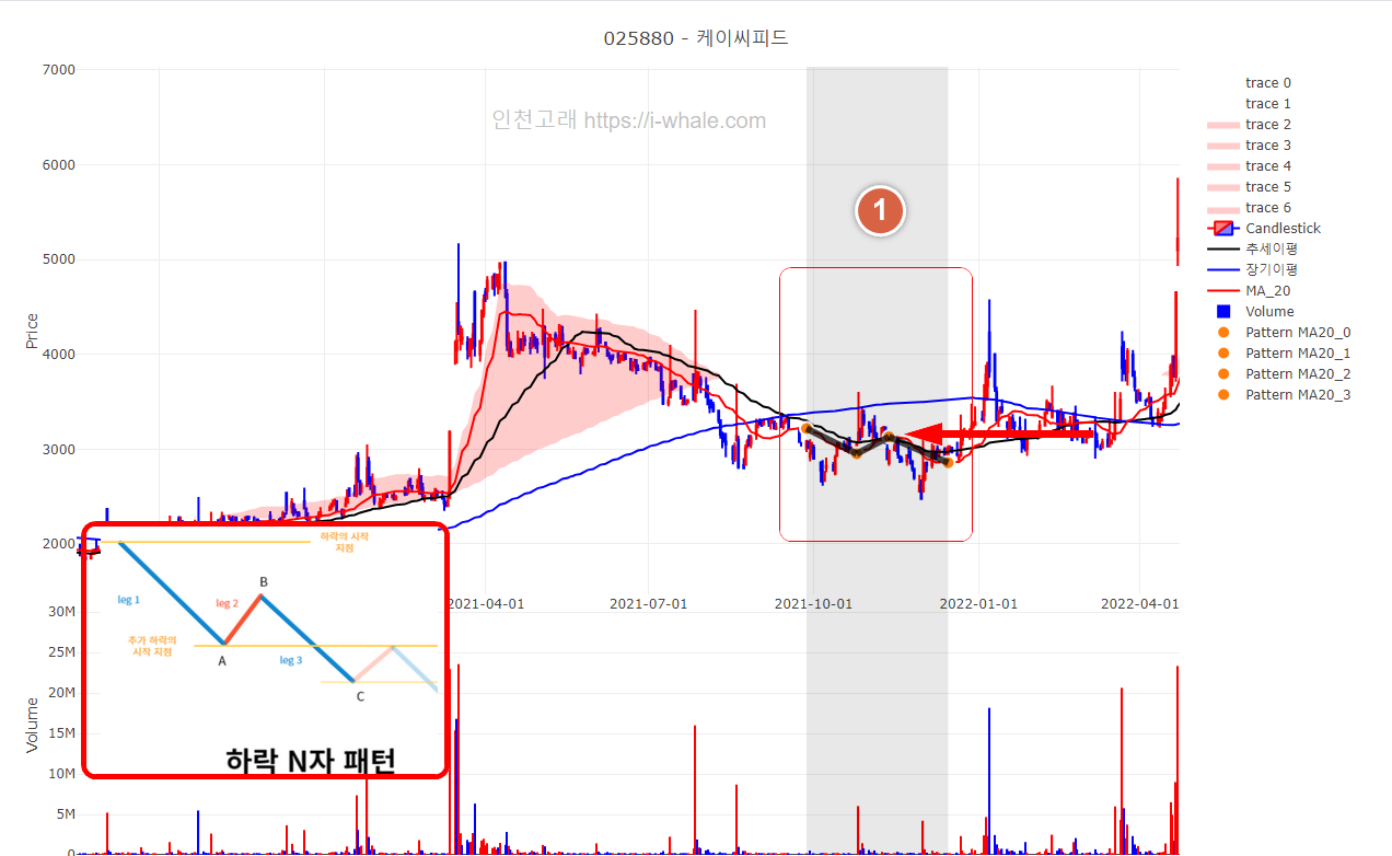 케이씨피드는 8개의 '하락 N자 패턴'이 발생되었으며 2파 조정구간에서 총 3개의 패턴이 발생되었습니다.