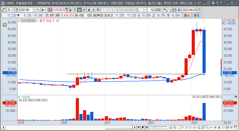 2연속 하한가 다우데이타(주봉, 월봉)
