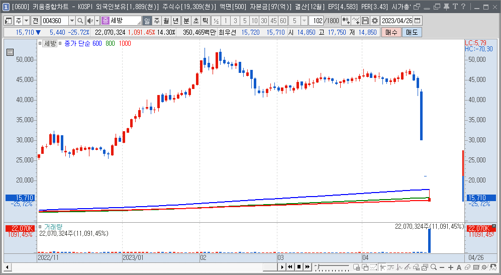 아래에 <세방>과 <다우데이타>의 일봉에 600일선과, 800일선 그리고 1,000일선 이평을 추가하였습니다.