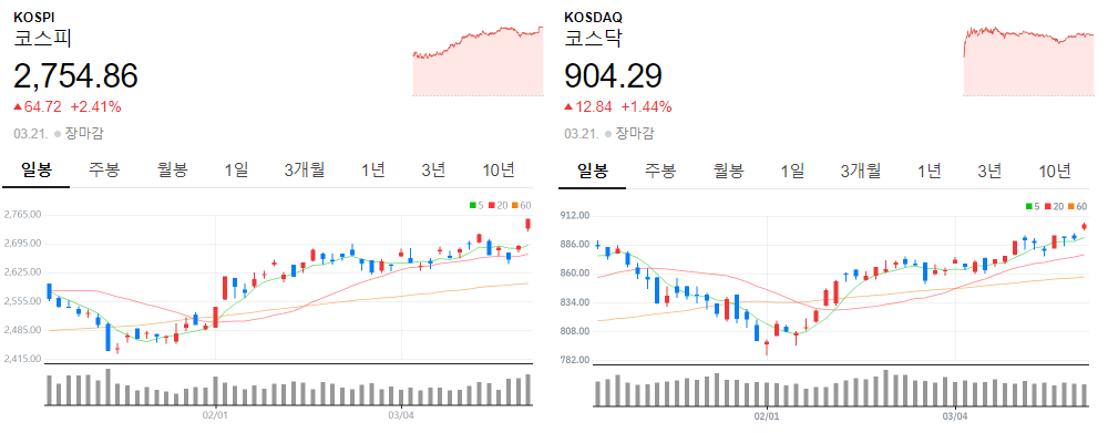 금일은 코스피가 +2.41%로 큰 폭의 상승을 보여줬으며 코스닥은 +1.44% 로 상승 마감 했습니다.