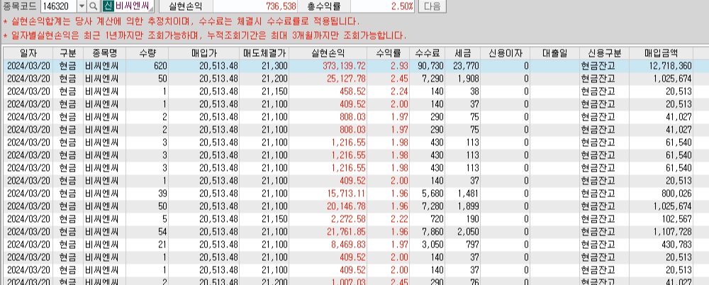 그 이유는 위에서 언급한 바와 같이 HMM과 같이 예수금 조절을 잘 못해서 미수로 종목이 매수가 되었었고 이에 오늘 반대 매매가 나간 상황입니다. +736,538원 수익입니다.