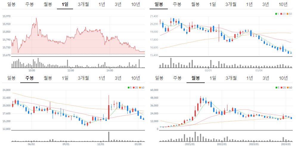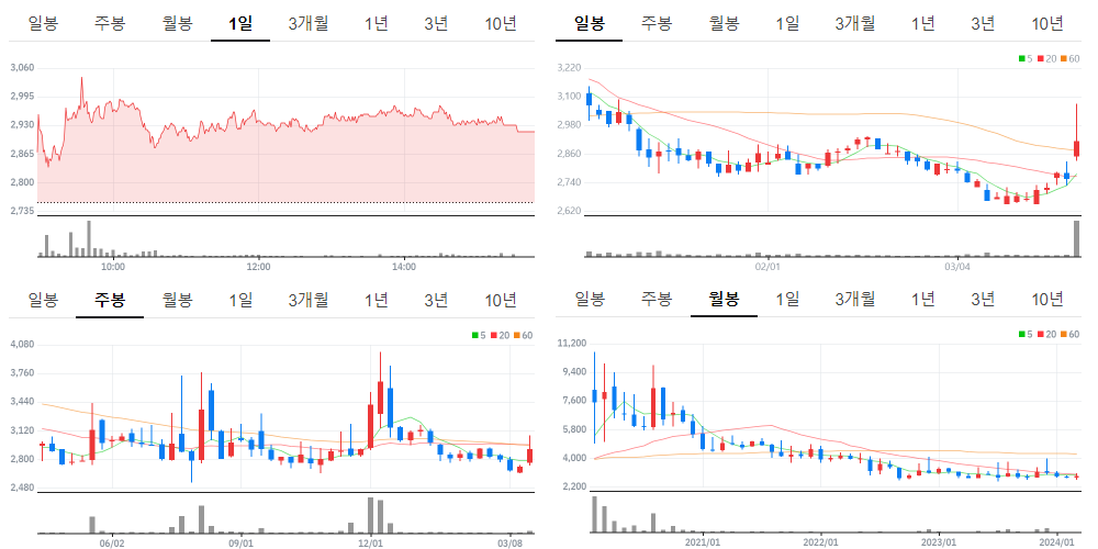 일봉상 차트를 보면 1파 하락 구간의 매물대에서 전량 매도가 되었었으며 주봉상에서는 60일선 저항선 부근까지만 상승을 하고 조정을 받은 케이스입니다.