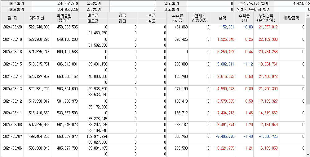 오늘은 전일 대비 소폭 상승하여 총 누적 수익률은 +21,957,012원입니다.