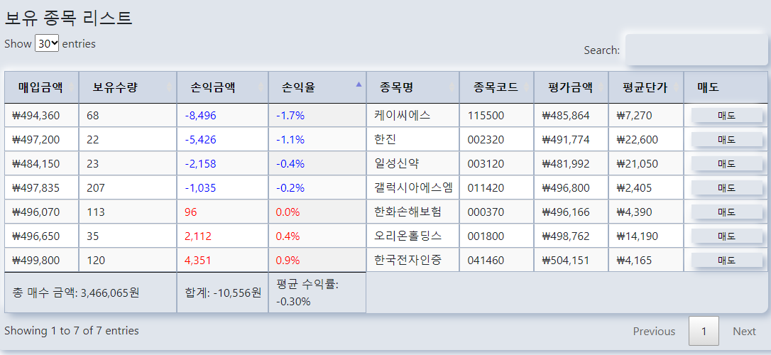 현재 보유종목은 케이씨에스, 한진, 일성신약, 갤럭시아에스엠, 한화손해보험, 오리온홀딩스, 한국전자인증 이렇게 7 종목입니다.