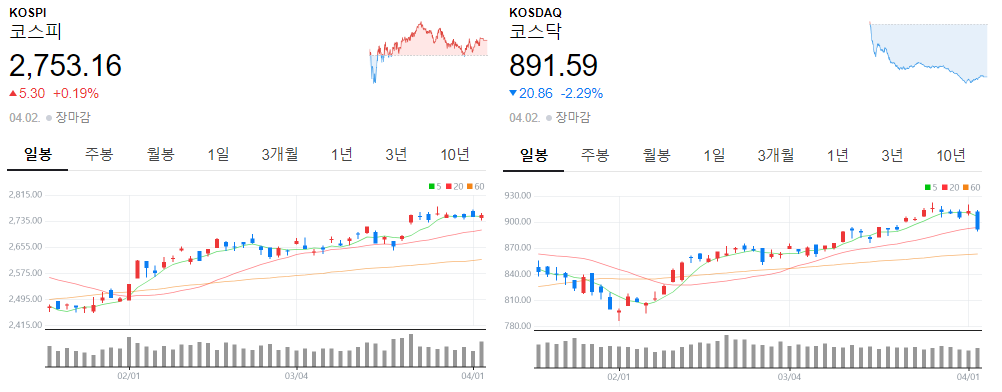 4월 첫째주부터 지수가 조정흐름을 보이고 있죠? 사실 3월 마지막주차부터 지수가 횡보하면서 상승폭이 줄어들며 이격도를 줄였었는데 4월 들어서면서 10일 이동평균선을 데드크로스, 20일선 데드크로스(코스닥)까지 힘차게(?) 조정을 주는 모습입니다.