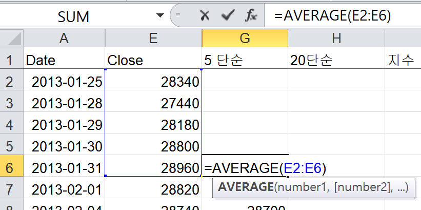 아래에 보면 구글시트에서 엑셀로 변환한 파일을 열어서 5일 이동평균선을 만들어 본 이미지입니다.