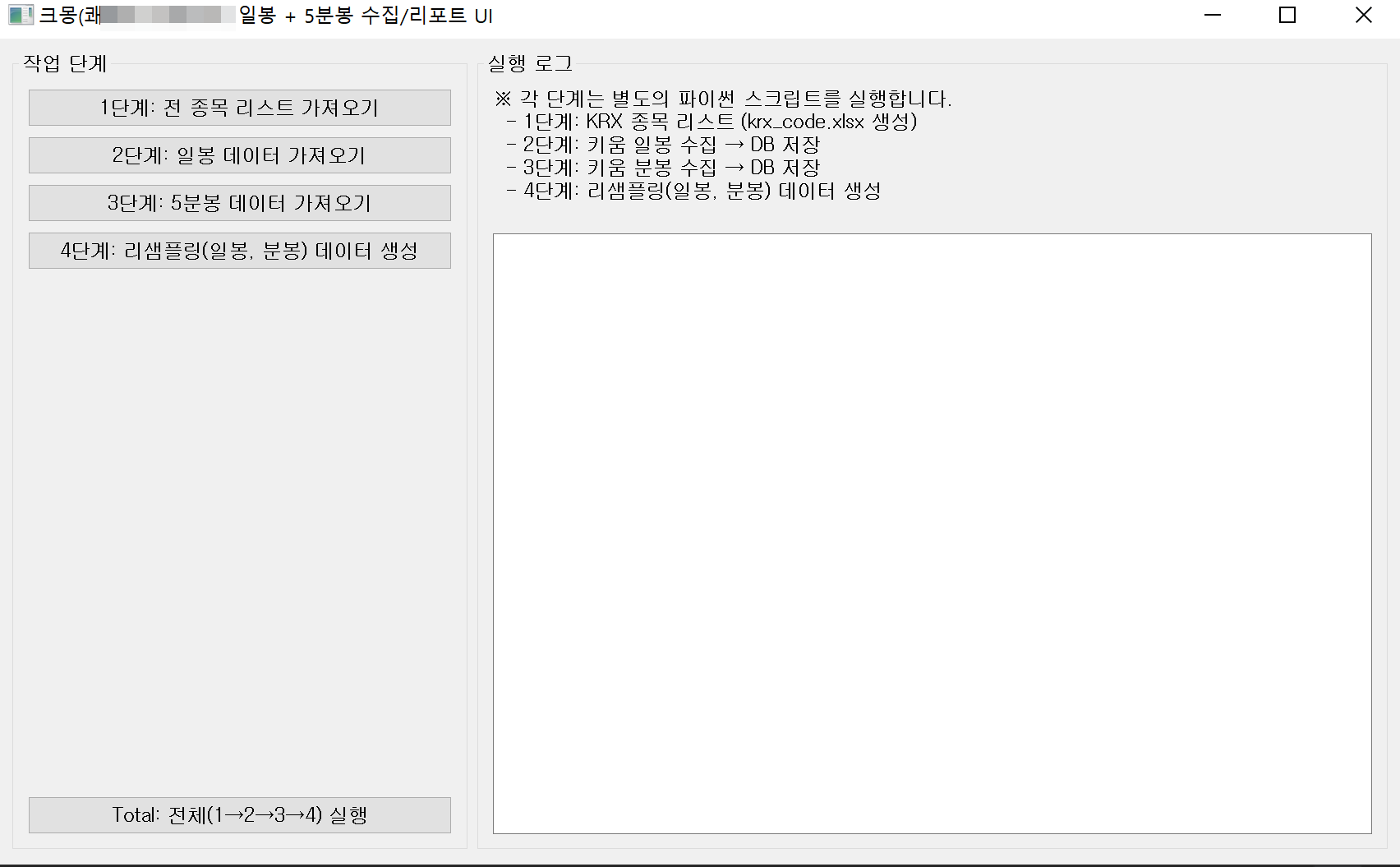 이 프로그램은 KRX에서 종목/기초정보를 정리한 뒤 → 키움 OpenAPI로 일봉/분봉을 수집하고 → 사용자가 원하는 분봉 단위로 리샘플링하여 DB/리포트를 생성합니다.