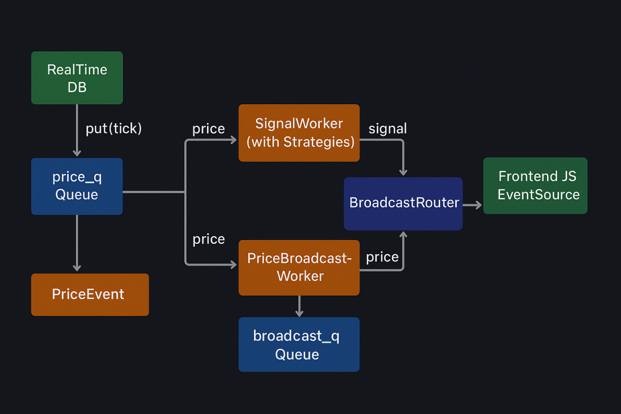 | SSE 라우트 (/SSE_Price/) | broadcast_q 소비 → HTTP Server-Sent Events | JS EventSource가 실시간 가격+시그널 모두 수신 |