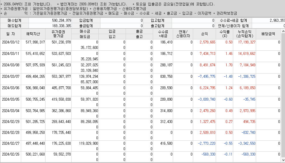 2월 27일부터 오늘(3월 12일)까지의 누적수익(보유종목의 손익 포함)은 아래와 같습니다.