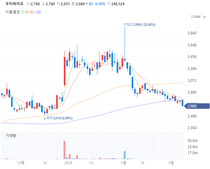 우리바이오 종가 차트 2024-03-08 금요일