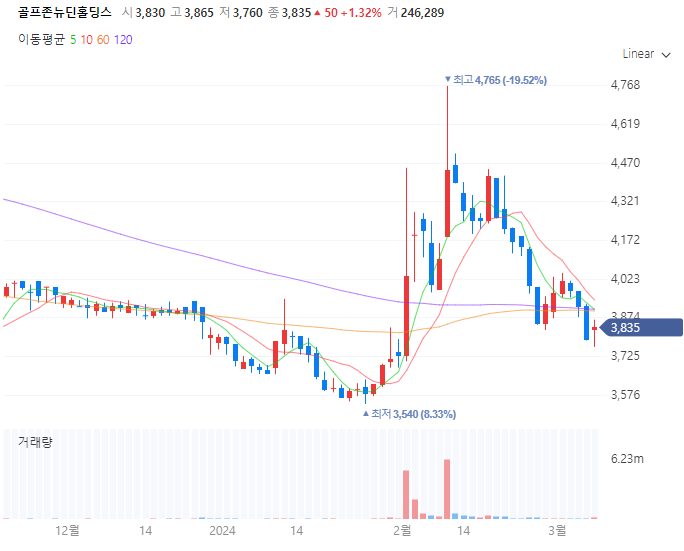 골프존뉴딘홀딩스 종가 차트 2024-03-08 금요일