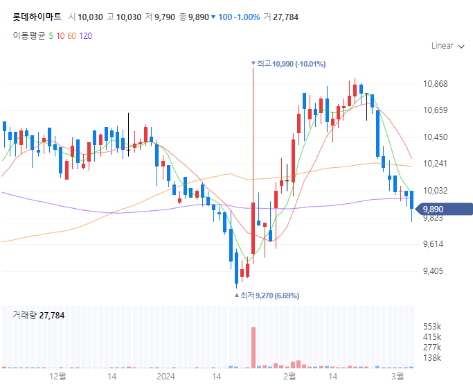 롯데하이마트(071840)의 흐름을 한 번 보도록 하겠습니다.