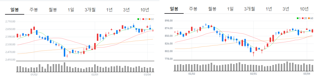 전일 미국 시장의 반도체 관련주들이 -2%대 하락한 것과 관련하여 국내의 지수도 영향을 받아서 장초에 갭하락 출발하였으나 상승 시도를 하며 전반적으로는 흐름이 괜찮았던 하루였습니다.